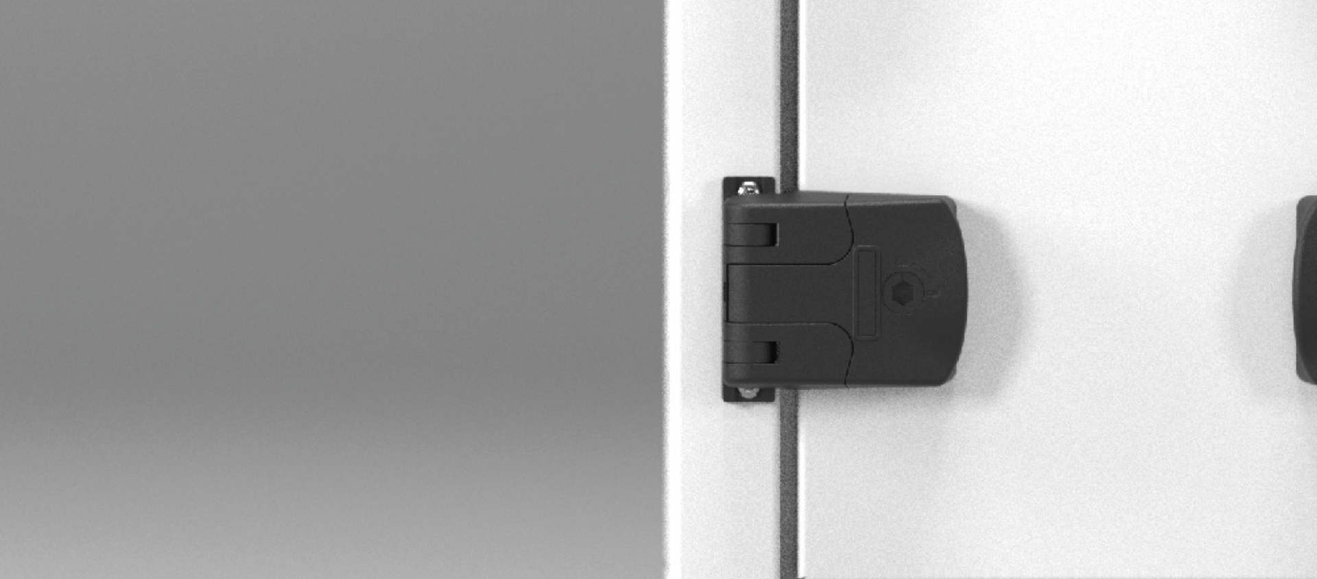 This robust latch hinge is adjustable vertically, creates 6 mm of compression and is available in three locking versions: tool-operated, key-locking and non-locking. The built-in safety catch provides a safe two-stage opening process that allows the cabinet to depressurize before it is fully opened.