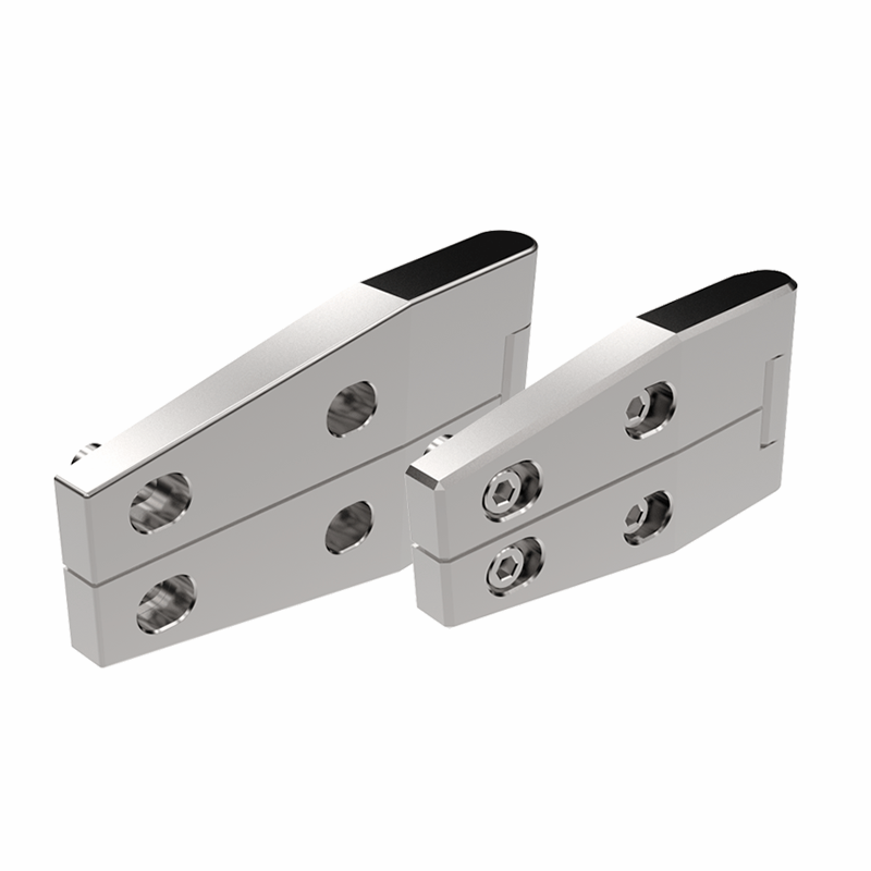 Specifically designed hinges to simplify mounting on insulated doors. Adjustable in the X- and Y-axis by 3 mm and with opening angle 180°.