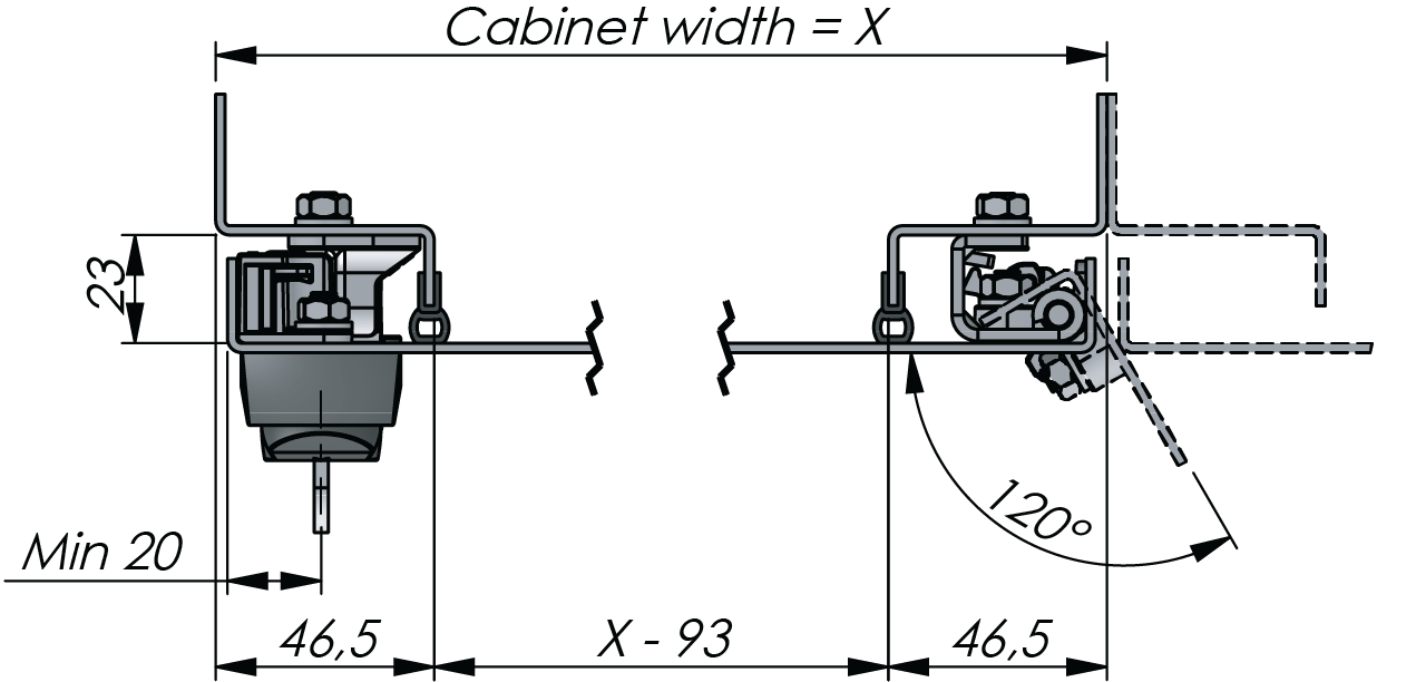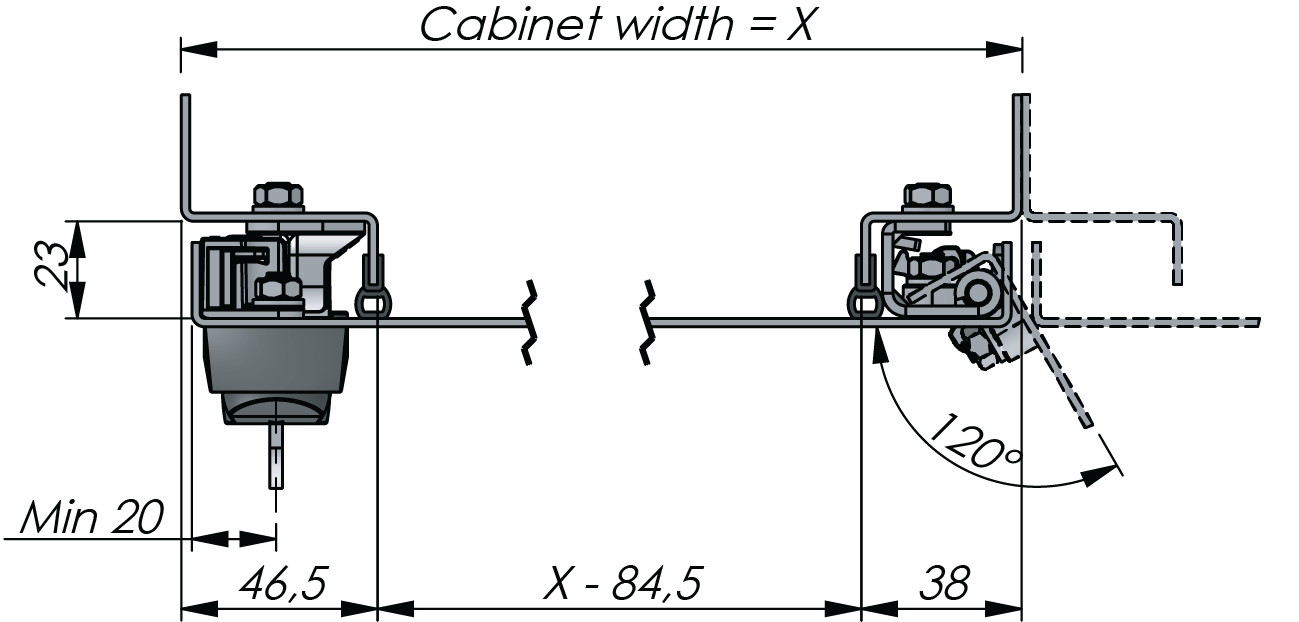 Minimized space for frame design, maximized usable cabinet width. External hinges optional with earthing kit.